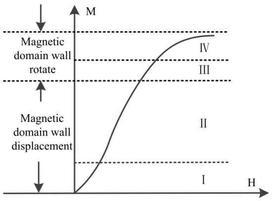 The whole magnetization process can be described by the magnetization curve shown in Figure 2, including reversible domain wall displacement (I), irreversible domain wall displacement (II), reversible domain rotation (III), and near saturation (IV). The domain motion in the four stages (or the entire magnetization curve) is affected not only by the microstructure, but also by the stress state.
