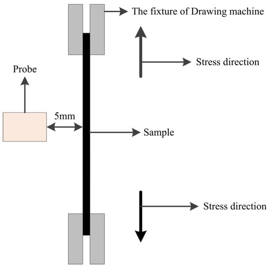 The distance between the 3MA probe and the sample was kept constant at 5 mm, and the magnetic field direction was perpendicular to the stress direction (rolling direction). Then, the samples were subjected to an external stress loading test (Figure 4). Tensile stress is applied in the rolling direction of the samples, and the applied stress is in the range of 5–80 MPa (much less than the yield strength) in order to ensure that no plastic deformation occurs in the sample. The stress gradient was 5 MPa, and each stress state was kept static for 10 min to ensure that both stress and strain were stabilized, and the detection time was not less than 30 s for each stress state.