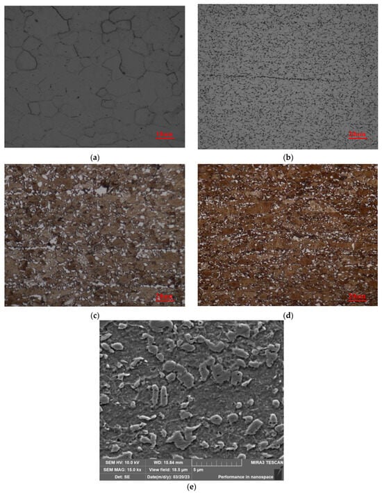 Microstructure of OM samples with different carbon contents. (a) Sample 1, (b) Sample 2, (c) Sample 3, (d) Sample 4, and (e) SEM imagery of Sample 3.