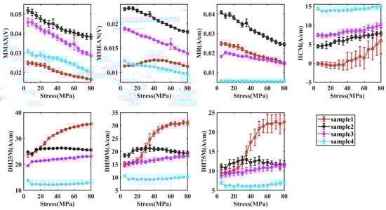 Figure 7 demonstrates the response of MBN characteristics to stress in the elastic strain range, from which it can be concluded that MBN characteristics change monotonically with the increase of stress. Applying tensile stresses in the rolling direction produces the effect of compressive stresses acting in the perpendicular rolling direction. With increasing tensile stress in the rolling direction, the MMAX, the MMEAN, and the MR in the vertical rolling direction in different samples show a monotonically decreasing trend; however, the HCM monotonically increases. The anisotropy of samples increases and the magnetic domains are more likely to move in the direction of the easy magnetization axis (rolling direction), and the external stress further decreases the exchange energy of the magnetic crystals in the rolling direction. In the perpendicular easy magnetization direction, it is more difficult for the domains to move, and the MBN signals are weakened.