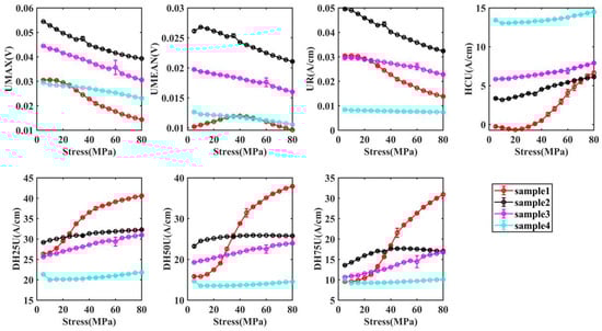 Figure 8 demonstrates the relationship between MIP signal and stress in the elastic strain range for materials with different microstructures, from which it can be concluded that MIP characteristics change monotonically with the increase of stress. Similar to the variation pattern of MBN signal, with the increase of tensile stress in the vertical rolling direction, the UMAX, the UMMEAN and the UR in the rolling direction show a monotonically decreasing trend; however, the HCU monotonically increases.