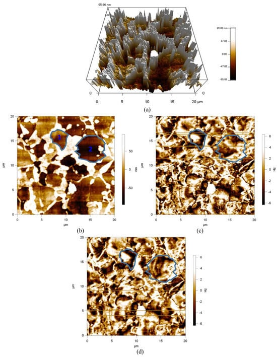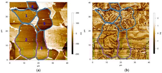 Atomic force microscopy (AFM) (Benyuan Nano Instrument Co., Ltd., Guangzhou, China) and magnetic force microscope (MFM) (Keens China Limited, Tokyo, Japan) assessments were performed using small specimens (10 × 10 mm2) in order to observe the magnetic domains [15,16]. The MFM measurements were performed under ambient conditions using commercial MFM instruments: an MFP-3D atomic force microscope from Asylum Research and a PPP-MFMR-10 probe from Nanosensors. Before the measurements, the samples were polished to achieve a mirror effect and then etched using Nital (96% ethanol + 4% nitric acid) for seven seconds.