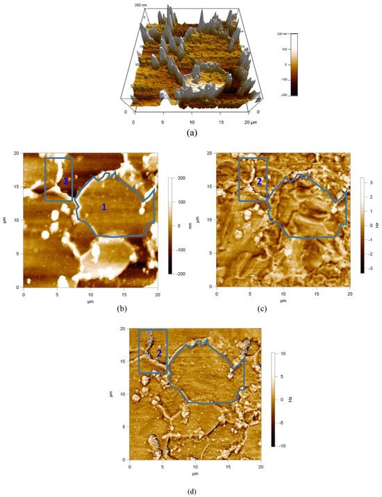 For sample 1, the height difference exists on the sample surface because the ferrite is easily corroded after corrosion and the carbon-rich phase (cementite Fe3C, pearlite, etc.) is not easily corroded (Figure 9a). At the same time, the presence of carbon-rich phase makes the lattice defective, and dislocation density increases while lattice distortion energy increases, thus increasing the microscopic residual stress of the material. During the AFM inspection, the MFM probe encounters higher tissue and produces the black lines in the figure (Figure 9b).