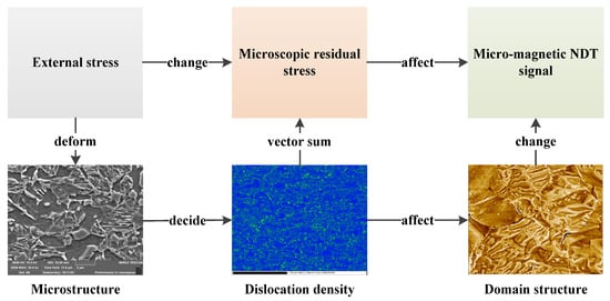 Magnetic properties are sensitive to microstructure as well as stress [1,2,3]. However, in practical applications, changes in material microstructure are often accompanied by changes in stress. Thus, it is not simple to directly relate magnetic properties to stress and microstructure. Domain wall motion (reversible and irreversible) can be impeded by stress-induced pinning effects [4,5]. The accompanying “hardening” of the microstructure produces a high dislocation density, which also affects the motion of the magnetic domains. If the microstructure characteristics of the material are not known, the stress evaluation will lead to great misjudgment, leading to inaccurate stress predictions [1]. Neglecting the effect of stress on micro-magnetic nondestructive testing techniques, the accuracy of microstructure characterization will also be reduced.