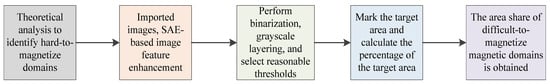 Image gray level layering technique based on Python was used for magnetic domain feature extraction [34]. First, the image is binarized by choosing a suitable threshold value, and then the area share of the target pixels is extracted as the area share of the difficult-to-magnetize magnetic domains (Figure 14) [34] The quantitative results are shown in Table 3.