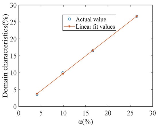 By comparing Table 2 and Table 3, it can be seen that the characteristic microstructure (α) has a strong consistency with the magnetic domain characteristics (Figure 15), and the relationship is almost linear. The fitting relationship is as follows: y = 1.2048 x − 0.4066.