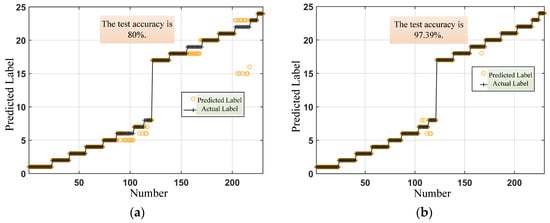 In addition, as shown in Figure 16a, part of the pattern recognition result is label 15, while the actual label is 23. After querying the original data, it is found that the micro-magnetic features corresponding to the actual labels of 15 and 23 are cross-interfering, which leads to the wrong result of pattern recognition. However, the labels 15 and 23 can be distinguished, after adding the magnetic domain feature.