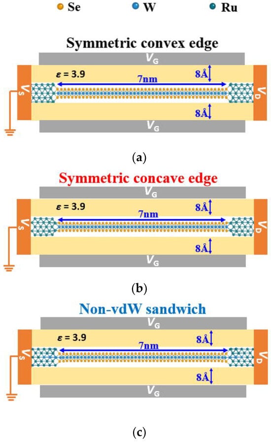 WSe2/Ru contacts as an example to illustrate a simulated double-gate monolayer TMD-based FET with a 7 nm channel. The gate oxide is set to be 8 Å. (a) Symmetric convex edge contacts. (b) Symmetric concave edge contacts. (c) Non-vdW sandwich contacts.