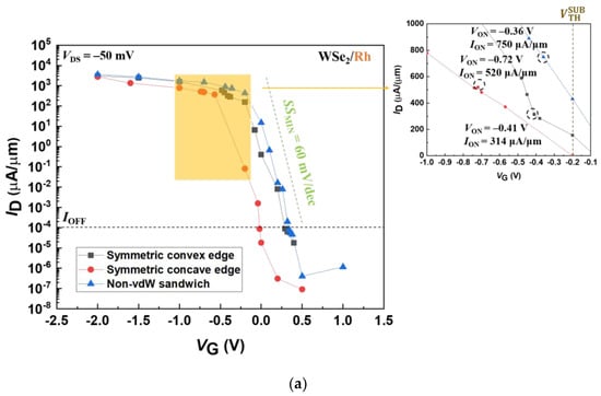 These SB FETs display various electrical properties through all the above contact-engineered geometries. The current can be increased by decreasing the SBW due to the corresponding tunneling probability. Also, the holes with energies above the SBH can be injected into the TMD channel. After conversion to RC from ID at VDS = −50 mV, the above RC values are categorized into contact geometries and contact leads, as shown in Figure 6a,b. From the comparison of these nine WSe2/metal FETs, the change in RC is interestingly consistent with the trend of the contact-engineered SBWs. As depicted in Figure 6a, the non-vdW sandwich contacts (marked in blue) tend to yield a narrower SBW than their symmetric counterparts (marked in red for concave and black for convex, respectively). The data shown in Figure 6b further suggest that Rh (orange) and Ru (green) offer a narrower SBW than Pd (purple). What is even worse is that the higher SBH is formed at various contacted-engineered WSe2/Pd interfaces compared to other corresponding interfaces constructed by Ru and Pd. Thus, the corresponding ION is partly hindered by the SBH, therefore deteriorating the contact performances of these WSe2/Pd contacts. Finally, the best- and worst-case scenarios are obtained considering the combination of the contact geometries and leads. The WSe2/Rh non-vdW sandwich contacts exhibit the lowest SBH of 0.32 eV, whereas their WSe2/Pd symmetric convex counterparts display the most undesirable SBH above 0.5 eV. Therefore, the former is expected to have a negligible SBH by applying VON, and the latter has a non-negligible SBH at VON. Consequently, the WSe2/Rh non-vdW sandwich contacts display the lowest RC of 33 Ω∙μm, whereas their WSe2/Pd symmetric convex edge counterparts show the highest RC of 213 Ω∙μm. Conclusively, our demonstration provides a novel strategy to achieve the lowest RC and SSMIN, unveiling the advantages of noble metals over conventional metals. Combining the effects of noble metals and contact-engineered topologies establishes the optimized electrical performances of WSe2 FETs. Our optimization serves as a reasonable starting point for fabricating such ultra-scaled FETs.
