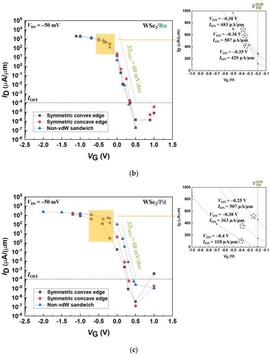 The contact leads can also affect the performances of TMD-based FETs due to the various SBs across the TMD/metal interfaces [69,70]. Through a deep dive into comparing a contact topology with different contact metals, further analysis can be performed by revisiting Figure 3. First, the WSe2/Rh FETs generate more shifts in the ID−VG curves than the WSe2/Pd FETs. The former shows approximately 500 mV and the latter 250 mV. Furthermore, compared with the above two FETs, the contact-engineered WSe2/Ru counterparts exhibit minimal shifts (~50 mV). Via the insets of Figure 3a–c, the shifts of VON clearly show high consistency with those of the transfer characteristics. These VON values shift slightly due to the insubstantial shifts among the corresponding ID−VG curves, and vice versa. This suggests that WSe2/Ru FETs can achieve the most stable circuit operation [71], outperforming their WSe2/Rh and WSe2/Pd counterparts.