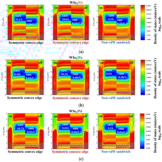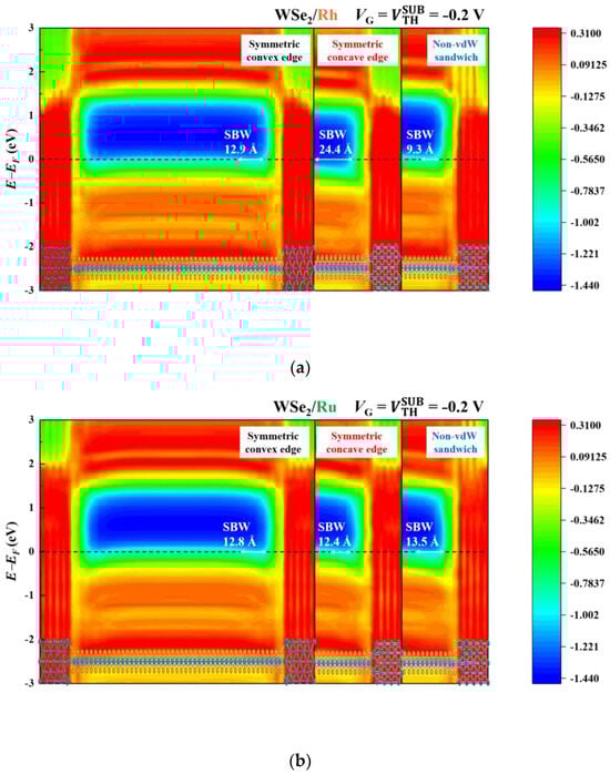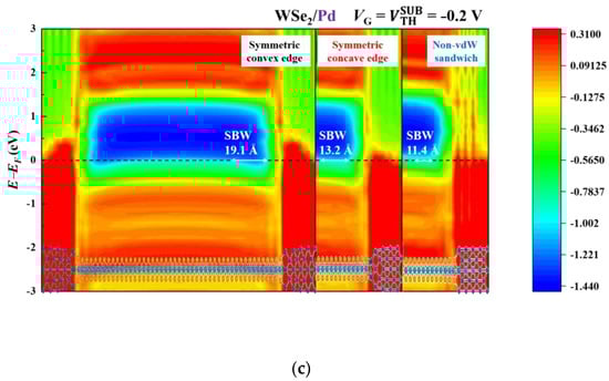 SBWs and SBHs across the TMD/metal interfaces are well-known as critical factors for dominating the performances of the TMD-based FETs [68]. Such two quantities can be indicated by the band diagrams revealed by the local device density of states (LDDOS), further impacting quantum transport. At room temperature, current transport is mainly limited by an SBW when not overcoming an SBH thoroughly. Such a primary consideration is essential when the FET is not turned on. At this stage, VG = = −0.2 V is taken to be an example. The corresponding LDDOS for these contact-engineered FETs are illustrated in Figure 4. From Figure 4a, the WSe2/Rh FET based on the symmetric concave edge contacts displays the widest SBW of 24.4 Å, compared to the other two contact geometries. This widest SBW suggests that such a WSe2/Rh contact configuration offers the lowest ID. The current flow is lower than the others by four orders of magnitude, as observed in Figure 3a. Next, no significant SBW difference (12.4~13.5 Å) among the three WSe2/Ru contact topologies is shown in Figure 4b, although the non-vdW sandwich contacts form the widest SBW. Thus, no considerably different transfer characteristics are established in Figure 3b. For the WSe2 contacts with the Pd leads, the symmetric convex edge contacts exhibit the widest SBW (19.1 Å) in Figure 4c, accompanied by the lowest ID (a few μA/μm) in Figure 3c. When the applied VG reaches VON, the FET is then turned on. The simulated WSe2 FETs in the on states are displayed in the left panels of each band diagram, as shown in Figure 5. In contrast, the corresponding off states are seen in the right panels. The SBWs and SBHs are depicted on each diagram’s left and right sides. For a single WSe2 FET, a significant difference exists among these contact geometries. Take the WSe2/Ru contacts in Figure 5b as an example. These undesirable SBHs appear over the range of 0.38 to 0.43 eV, and their corresponding SBWs vary from 8.8 Å to 11.8 Å. Direct and thermally assisted tunneling behaviors are involved in carrier transport across an SB at 300 K. In the on state, the non-vdW sandwich WSe2/Ru FET has the narrowest SBW of 8.8 Å and the lowest SBH of 0.38 eV. Consequently, this simulated FET achieves the highest ION of 683 μA/μm due to the minimal SBH and SBW, implying the lowest RC value. Next, the SBW is 10.3 Å for the symmetric concave edge contacts, which is more significant than the above-mentioned counterpart, thus having the second-best ION of 587 μA/μm. Lastly, the ION of 420 μA/μm flows through the symmetric convex edge contacts with the highest SBH of 0.43 eV and the widest SBW of 11.8 Å.