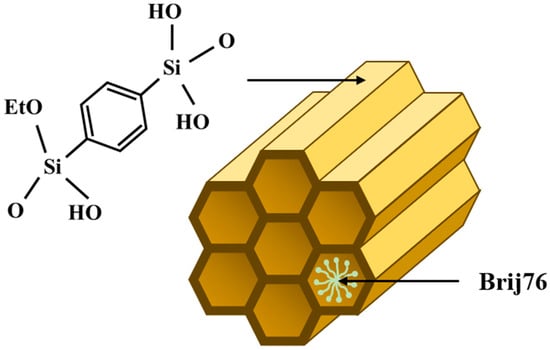 Periodic mesoporous organosilica (PMO–benzene) was synthesized via acid-catalyzed hydrolysis and the condensation of bis(triethoxysilyl)benzene following the method outlined by Burleigh [58,59]. In this process, 6 g of the surfactant BrijS10-Brij76 (Polyoxyethylene (10) stearyl ether) was dissolved in a solution of 19.6 mL of HCl and 279 mL of H2O while being stirred at 50 °C for 24 h. Subsequently, 17.2 mL of 1,4-bis(triethoxysilyl)benzene was added, and the mixture was continuously stirred at 50 °C for another 24 h. The solution was then kept at 90 °C under static conditions for an additional 24 h. The resulting precipitate was collected through vacuum filtration and washed with H2O. To remove the surfactant, the synthesized material was stirred in a HCl solution (1:50 ratio) at 80 °C for 12 h. Finally, the product was filtered, washed with ethanol, and dried under vacuum for 10 h. The molar ratios of Brij76, H2O, HCl, and organosilane used in the reaction were 0.11:222:3.20:0.56.