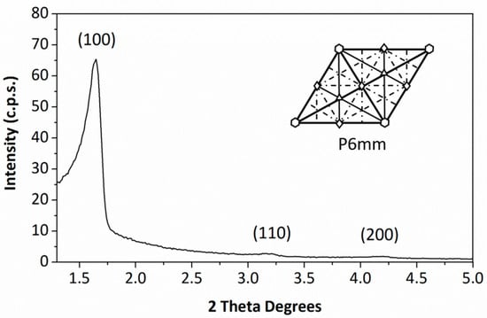 High-quality PMO–benzene was characterized. As illustrated in Figure 2, the XRD pattern of the sample displays its most prominent peak (100) at d = 53.4 Å. Additionally, two smaller and broader peaks were observed at approximately d = 27.3 Å (110) and d = 21 Å (200). These peaks confirm that the sample is a mesoporous material with a 2D hexagonal (P6mm) structure, characteristic of the organosilica PMO–benzene, consistent with the literature [36,76].