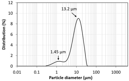 Figure 3 presents the particle size distribution, revealing a bimodal pattern. The primary peak is narrow, ranging from 2.5 to 35 μm and centered at 13.2 μm, suggesting uniformity in particle size within the sample. A secondary peak appears between 0.3 and 2.5 μm, with a center at 1.45 μm, indicating the presence of a smaller particle group.