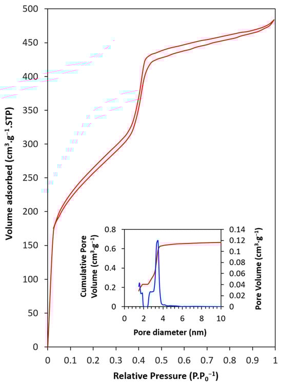 Figure 4 displays the N2 adsorption–desorption isotherm, which is Type IV according to the IUPAC. The first portion of the isotherm corresponds to monolayer–multilayer adsorption, with a well-defined adsorption limit at pressures approaching p·p0−1 = 1 [77,78]. The hysteresis in the multilayer region is indicative of capillary condensation within the mesopores. This hysteresis is classified as type H1, which is associated with a pore system that features a relatively regular arrangement and a narrow distribution of uniform mesopores [78,79], consistent with the XRD-derived crystal structure. Most pores were small mesopores, ranging from 2.4 to 4.1 nm, with a predominant pore diameter of 3.47 nm, and the total pore volume was 0.68 cm3·g−1 (Table 1). The BET method revealed a high surface area of 928 m2·g−1, which explains the material’s significant adsorption capacity. Additionally, several micropores were identified, contributing 139 m2·g−1 to the total surface area, representing 15% of the total.