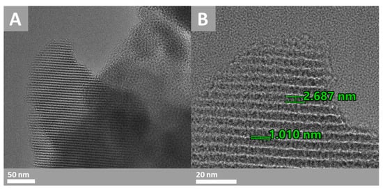 A TEM was used on the PMO–benzene samples. Figure 5A shows the ordered pore structure of the material from two perspectives: longitudinal and transverse to the pore network. Figure 5B shows channels with a porous diameter around 2.867 nm, i.e., a pore size which agrees with the pore-size distribution (2.4–4.1 nm). The value of 1.01 nm corresponds to the thickness of the channel wall.