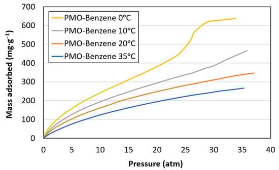 - PMO–benzene featured the maximum adsorption (638.2 mg·g−1) at 0 °C and 34 atm.