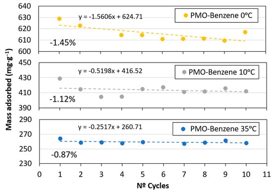 In order to analyze the decrease in adsorption and to explore the potential for reusing the material as a CO2 adsorbent, a study was conducted involving 10 consecutive adsorption–desorption cycles at 0 °C, 10 °C, and 35 °C (Figure 7). The linear trend and maximum adsorption for each cycle are shown in Figure 8. After 10 cycles, there was a small loss in adsorption in all cases, with loss amounts between 1% and 1.5%. The working temperature did not seem to affect the adsorption capacity loss. The results indicate the material’s potential for reuse without significant loss of performance.
