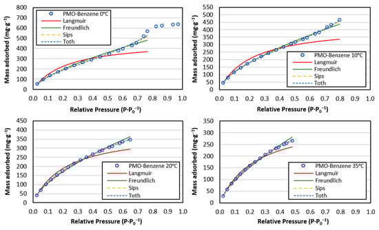 Fit curves of various models at 0 °C, 10 °C, 20 °C, and 35 °C for PMO–benzene.