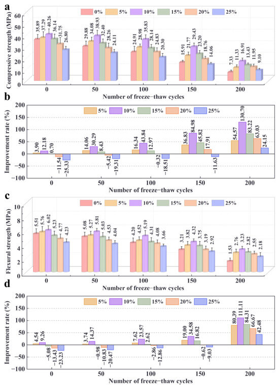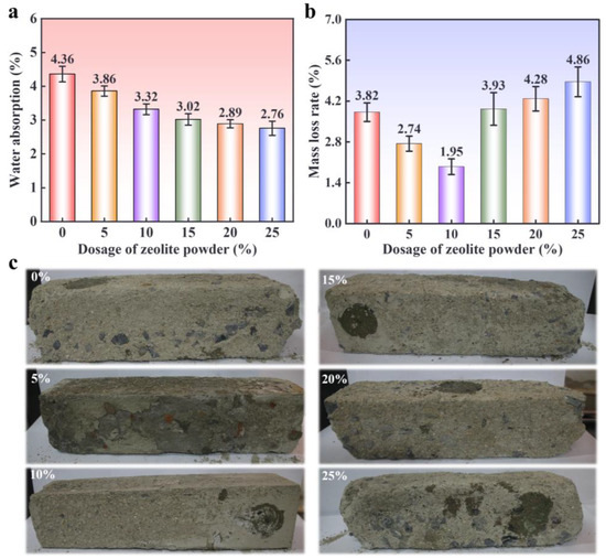 - Zeolite powder reduces the water absorption of ZPRC and improves FT durability and mechanical properties at dosages of 0 to 10%. In this study, the lowest specimen mass loss of 1.95% and the best compressive and flexural strength enhancement of 43.84% and 23.57% after 100 FT cycles were obtained with a zeolite powder dosage of 10%.