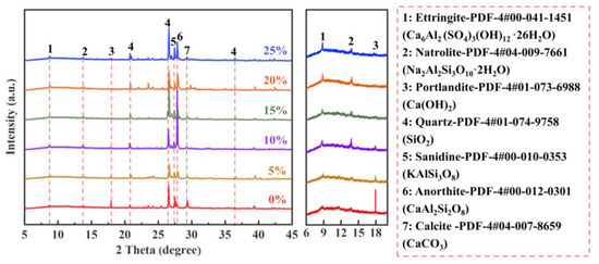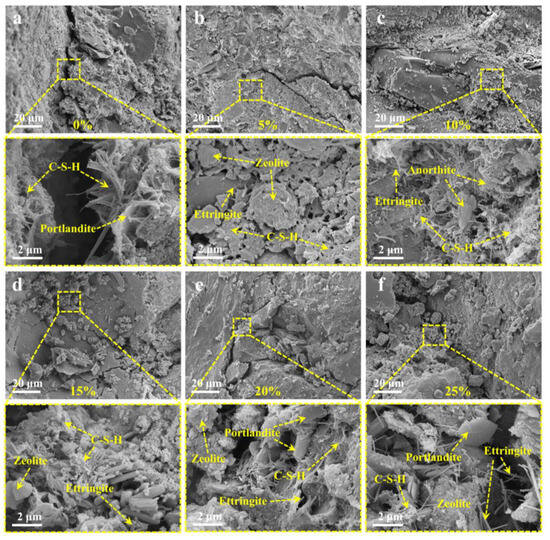 - When the zeolite powder content is 10%, the interconnection of C-S-H gel, ettringite, and anorthite in specimens makes the microstructure most dense. However, when the zeolite powder content is 15–25%, the C-S-H gel in ZPRC decreases, causing a loose microstructure.