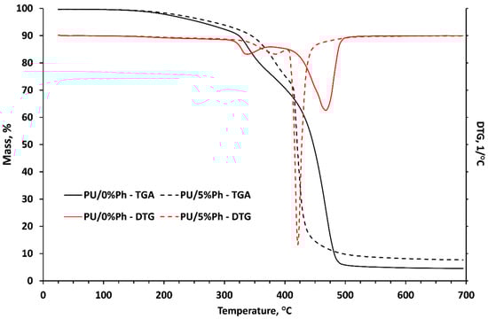 TG and DTG curves of samples PU/0.0%Ph and PU/5%Ph.
