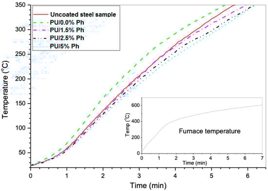 The furnace test was used to study the thermal-resistant character of the modified PU powder coatings. The profiles of temperature changes (of the coated steel substrates) in relation to the test duration are shown in Figure 4, while the photographs of the coatings, taken after the fire test, are presented in Figure 5. Detailed time values at which the coating reached a temperature of 350 °C are shown in Table 3.