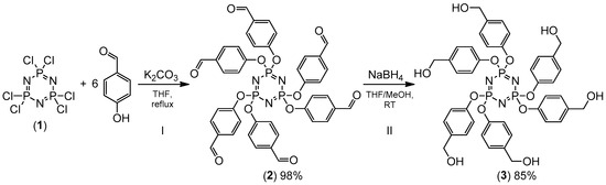Hexakis(4-(hydroxymethyl)phenoxy)cyclotriphosphazene (3) was obtained in a two-step nucleophilic substitution reaction of Cl atoms in hexachlorocyclotriphosphazene (1) with 4-hydroxybenzaldehyde in the presence of potassium carbonate, leading to the formation of hexakis(4-formylphenoxy)cyclotriphosphazene (2) in the first step and a further reduction in the aldehyde groups present in (2) to the hydroxyl ones carried out in the presence of sodium borohydride in the second step.