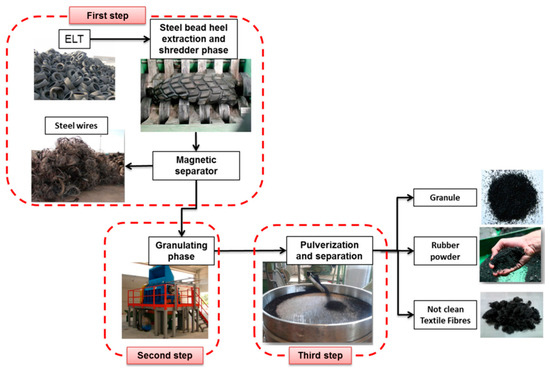 - Fazli, A.; Rodrigue, D. Recycling waste tires into ground tire rubber (GTR)/rubber compounds: A review. J. Compos. Sci. 2020, 4, 103. [Google Scholar] [CrossRef]