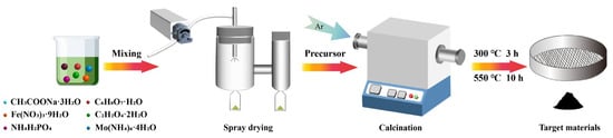Mox-NFPP nanocomposites were synthesized via a spray drying process, using raw materials including CH3COONa·3H2O (Beijing Chemical Works, Beijing, China, 99.7%), Fe(NO3)3·9H2O (Sinopharm Chemical Reagent Co., Ltd., Shanghai, China, 99.7%), NH4H2PO4 (Xilong Scientific Co., Ltd., Shantou, China, 99.7%), citric acid (C6H8O7·H2O) (Xilong Scientific Co., Ltd., Shantou, China, 99.7%), Mo(NH4)6·4H2O (Beijing Institute of Chemical Reagents Co., Ltd., Beijing, China, 99.7%), and oxalate (C2H2O4·2H2O) (Beijing Institute of Chemical Reagents Co., Ltd., Beijing, China, 99.7%). The materials, with varying Mo content (x = 0, 0.05, 0.10, and 0.15), were designated as 0-NFPP, Mo0.05-NFPP, Mo0.10-NFPP, and Mo0.15-NFPP, respectively. For instance, the preparation process for 0-NFPP involved dissolving a mixture of 20 mmol CH3COONa·3H2O, 15 mmol Fe(NO3)3·9H2O, 20 mmol NH4H2PO4, 11.25 mmol C6H8O7·H2O, and 45 mmol C2H2O4·2H2O in 50 mL deionized water through magnetic stirring. The solution was then spray-dried using an HZ-1500 experimental spray dryer (Shanghai Huizhan Experimental Equipment Co., Ltd., Shanghai, China), with an inlet temperature 220 °C, an outlet temperature ranging from 90 to 109 °C, a peristaltic pump speed of 23 r/min, a fan frequency of 40 Hz, and a needle interval of 2 s. Following spray drying, the precursor was calcined in an OTF1200X-II tube furnace (Shanghai Meicheng Scientific Instruments Co., Ltd., Shanghai, China) filled with argon at a rate of 5 °C/min, initially at 300 °C for 3 h, and subsequently heated at 550 °C for 10 h. After cooling, the precursor was ground and sieved to obtain the final product.