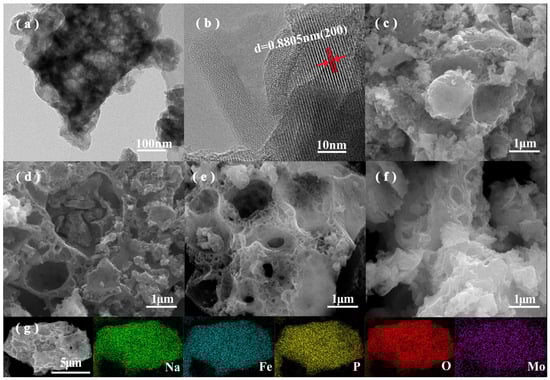 (a,b) TEM and HRTEM images of 0-NFPP. (c–f) SEM images of 0-NFPP, Mo0.05-NFPP, Mo0.10-NFPP, Mo0.15-NFPP. (g) EDS mapping images of Mo0.10-NFPP material.
