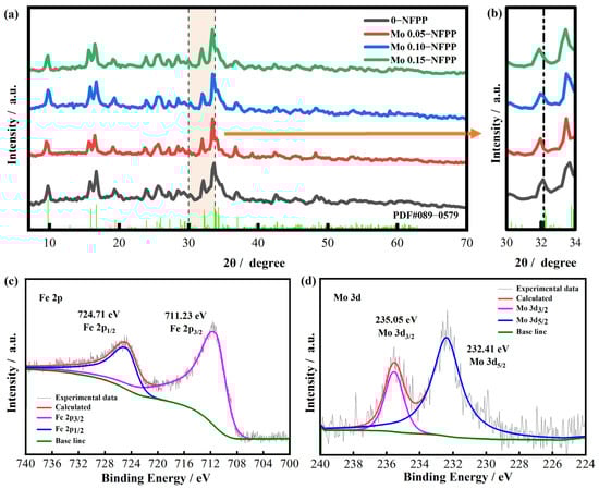 (a,b) XRD patterns of Mox-NFPP materials. (c) Fe 2p XPS spectrum and (d) Mo 3d XPS spectrum of Mo0.10-NFPP material.