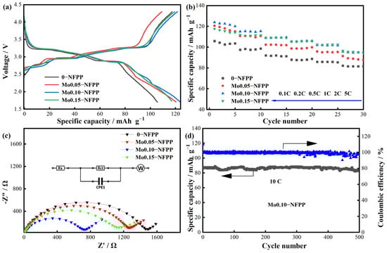 A series of electrochemical performance tests were carried out on the Mox-NFPP materials, as illustrated in Figure 4. Figure 4a presents the initial charge–discharge curves at a 0.1 C rate, where the four samples demonstrate similar profiles, featuring three pairs of redox plateaus at approximately 2.7 V, 3.0 V, and 3.2 V. These plateaus correspond to the sequential release of Na+ ions from the Na3, Na1, and Na4 sites, as referenced in previous studies [,,,]. The discharge capacities of the 0-NFPP, Mo0.05-NFPP, Mo0.10-NFPP, and Mo0.15-NFPP samples were 105.8, 120.5, 123.9, and 117.2 mAh g−1, respectively. The samples doped with Mo6+ displayed reduced charge–discharge polarization and achieved higher capacities compared to the undoped sample. Furthermore, the Mo0.10-NFPP sample demonstrated superior rate performance, achieving a specific discharge capacity of 95.71 mAh g−1 at a 5 C rate, as detailed in Figure 4b.