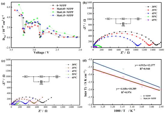 (a) Na+ diffusion coefficients of Mo-doped NFPP. (b,c) Variable-temperature impedance plots of 0-NFPP and Mo0.10-NFPP and (d) corresponding Arrhenius plots.