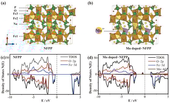 To further investigate the impact of Mo6+ ion doping on the conductivity of the material, the structure of the material before and after Mo6+ doping was studied using first-principles calculations. Following structural optimization, a doping model was constructed by substituting a Mo atom for any Fe atom at the Fe1 or Fe2 positions (Figure 6a). The calculated density of states shows that NFPP (Figure 6b) has a large bandgap (about 3.1 eV) and a conduction band with an energy level difference of about 2.9 eV from the Fermi level, which is consistent with the literature []. In contrast, the conduction band of Mo6+-doped NFPP (Figure 6c), which primarily consists of the non-bonding orbitals from Fe’s d orbitals, displays a reduced energy gap of 1.0 eV to the Fermi level, indicating typical n-type doping by Mo. This conclusion is further corroborated by the Bader charge analysis. In the Mo-doped NFPP model, the average charge of the six O atoms near the Mo atom is −1.4856 e, while other O atoms not directly bonded to Mo have an average charge of only −1.4789 e, indicating that Mo atoms have a stronger ability to confer a charge to nearby O atoms than Fe atoms. Consequently, the impurity level formed by the interaction of the Mo atom’s 4d orbitals with the surrounding O atom’s 2p orbitals is at a higher energy level close to the Fermi level, approximately 1.1 eV higher than the level formed by the interaction of the Fe atom’s 3d orbitals with the surrounding O atom’s 2p orbitals. Although Mo doping slightly reduces the bandgap width, the n-type doping by Mo atoms significantly shifts the Fermi level towards the conduction band, and it also forms the highest occupied impurity states near the Fermi level, which facilitates the transition of electrons from the valence band to the conduction band, thereby enhancing the conductivity. This is consistent with the previously mentioned significant improvement in the electrochemical performance of Mo6+-doped NFPP materials.