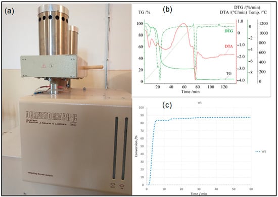 Drawing showing (a) Derivatograph-C, (b) the TGA curves and (c) the conversion curve.