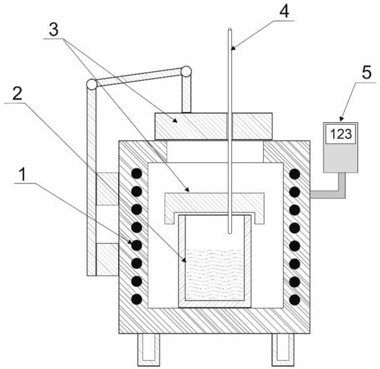 A schematic diagram of the research stand for slag reduction experiments: 1: electric resistance furnace; 2: crucible with the tested sample; 3: ceramic cover; 4: thermocouple; 5: device controlling the furnace operation.