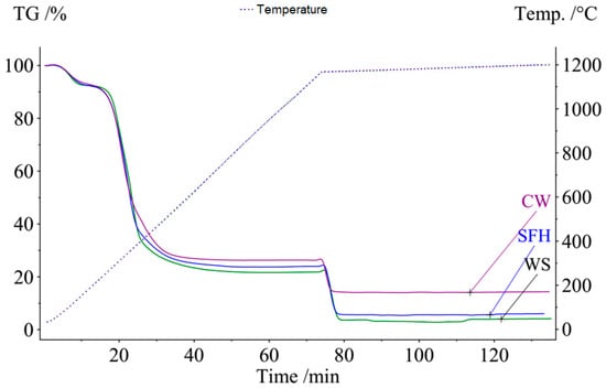 In Figure 3, TG curves derived in the reactivity tests of the coffee ground (SCG), sunflower husk (SFH) and walnut shell (WS) samples are presented.