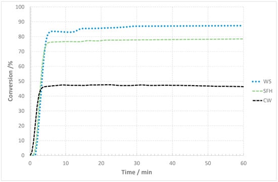 The calculated parameters from the TG analysis (Table 2) prove that the SFH reactivity is the highest among the three samples. In general, all three samples are classified as highly reactive, but we can see certain differences in the other monitored parameters. The time to reach the maximum reactivity ranged from 1.5 to 3 min, and the lowest value was recorded for the sample of spent coffee grounds. The time to reach 50% conversion in the CO2 atmosphere was more favourable for the SFH pellets but with small differences. A significant difference was observed in the inert conditions between the weight loss values because of the volatile components and possible moisture. The SFH and WS samples demonstrated significant weight loss (from 73% to 78%). The remaining part reacted relatively quickly with CO2 (as shown in the figure).