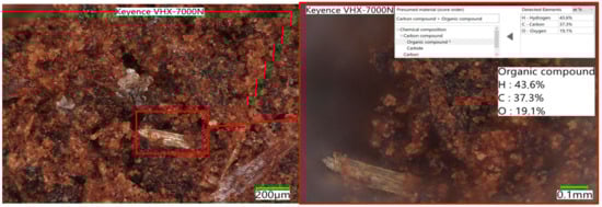 The degree of conversion (Figure 4) also shows significant differences in the maximum values reached as well as in the rate change itself. The 50% conversion within the reactivity test indicates a high conversion rate, but in the case of the spent coffee ground residue, a maximum of 48% was reached. In Figure 5, Figure 6 and Figure 7, the macrostructures of the samples observed using a 3D microscope (Keyence Corporation, Mechelen, Belgium) with the corresponding point analysis are presented.