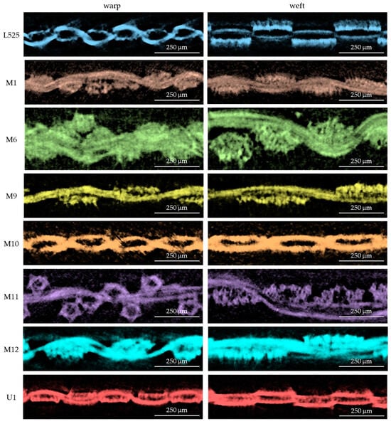 The data presented in Table 2 show that the elemental composition of the samples differs. Sample L525 has a thin Cu-Ni coating (25.4 wt%) because the combined content of the other elements is higher than that of the remaining fabrics. Samples U1, M11, and M10 have thick coating, and the combined content of the other elements is lower than that of the remaining fabrics.