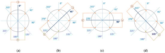 Van der Pauw configuration of electrodes on the circular sample for the direction defined by angle θ in the sample plane: (a) θ = 0°; (b) θ = 45°; (c) θ = 90°; (d) θ = 135°.