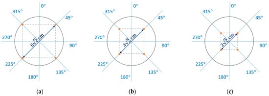 Three possibilities for arranging the electrodes, L, M, and S, on a fabric surface were considered wherein four electrodes form squares with side lengths of 6 cm, 4 cm, and 2 cm, respectively (Figure 4).