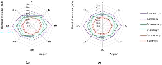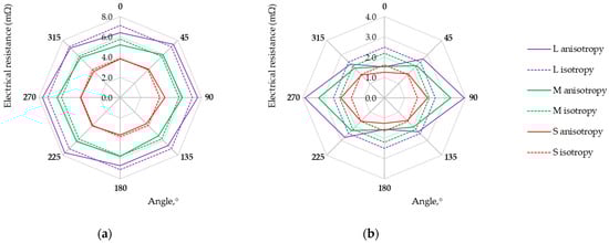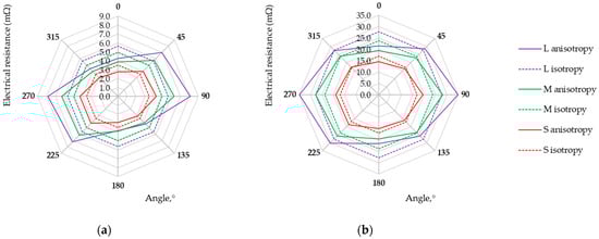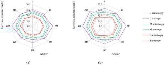 Measurements of the voltage drop for a fixed current value for electro-conductive fabrics were carried out at a temperature of 22 °C and relative humidity of 39%. Each measurement was repeated five times. The direction-dependent resistance of electro-conductive fabrics in the form of isotropy and anisotropy curves is presented in Figure 6, Figure 7, Figure 8 and Figure 9. Three possibilities for arranging the electrodes, L, M, and S, were considered.