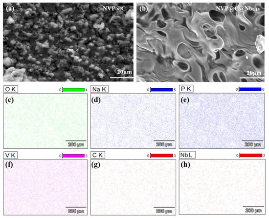 (a,b) SEM images of NVP@C and NVP@C@Nb0.15. (c–h) EDX plot of NVP@C@Nb0.15.