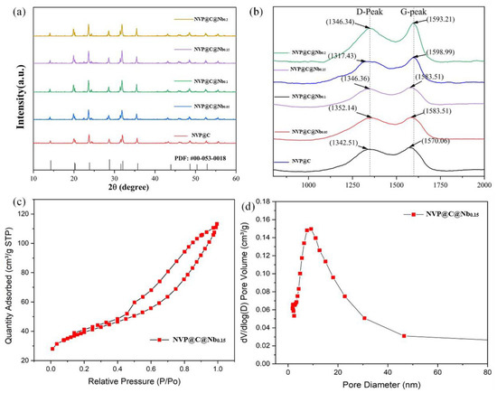 (a) XRD patterns of all-sample. (b)Raman spectra of all-sample. (c) Nitrogen adsorption/desorption isotherms of all samples. (d) the pore-size distribution of the NVP@C@Nb0.15.