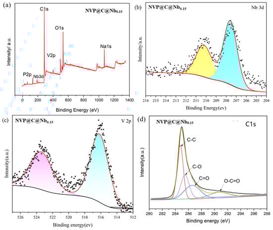The valence states of the materials were investigated by XPS, and the results are presented in Figure 3. The survey spectrum for both NVP@C and NVP@C@Nb revealed the presence of elements such as Na, O, V, P, C, and Nb. Specifically, the high-resolution V 2p (Figure 3c) spectrum of NVP@C and NVP@C@Nb could be fitted into two diverse peaks around 517.0 and 524.3 eV, which were assigned to V 2p3/2 and V2p1/2 orbitals of the V 2p electronic state, respectively [40]. Nb5+ doping can increase the electronic conductivity during the electrochemical reaction and accelerate the embedding and dislodging of Na+, which can be seen in V 2p3/2 and V 2p1/2 of V3+ in the split-peak spectra of V, indicating that the substitution of Nb for vanadium has not caused any change in the valence state of V. The high-resolution spectrum of Nb 3d orbitals was displayed in Figure 3b; the peaks at 211.25 eV and 208.12 eV could be assigned to Nb 3d3/2 and Nb 3d5/2 orbitals, which indicated that the Nb still belonged to the ortho-pentavalent state. The high density of the electron cloud of the outer layer of the metal of Nb5+ is prone to the formation of the Nb-O bond, and the electronic conductivity can be improved during the process of electrochemical reaction. In the C 1s spectrum (Figure 3d), the four peaks at 285.1, 285.7, 286.9, and 291.9 eV could be attributed to different carbon species: C–C, C–O, C=O, and O–C=O, respectively. These peaks reflected the presence of carbon in various chemical environments within the NVP@C and NVP@C@Nb, which was consistent with the carbon coating and the carbon components of the vanadium phosphate framework.