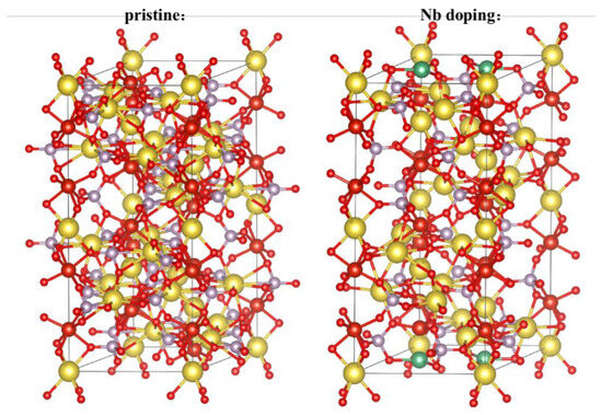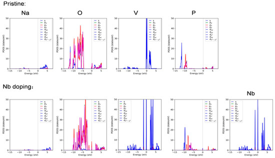 The results of the DFT calculations indicated that there was a total of 12 vanadium atoms in the unit cell of the system. According to the specified impurity ratio, 15% of these V atoms were replaced by Nb atoms, as shown in the Figure (Figure 4). Analysis of the partial wave density of states (PDOS) revealed that the electrons near the Fermi surface of the system were primarily contributed by the d orbitals of the vanadium atoms (Figure 5). After Nb doping, the d orbitals of the Nb atoms also contributed electrons that are concentrated near the Fermi surface. It could be concluded that the electronic properties of the system, which are crucial for its performance as an electrode material, were predominantly determined by Nb atoms presented in the structure.