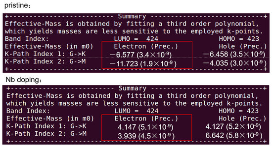 The figure depicting the effective mass of the system demonstrated that Nb doping would lead to a decrease in the effective mass in all directions, especially in the direction of the gap minimum (GM) (Figure 6). In a metallic system, the distinction between electrons and holes was not strict, and electrons were typically the default carriers. Therefore, when discussing the effective mass, we focused on the absolute value of the effective mass of electrons. As we all know, a smaller effective mass indicates that electrons experienced less resistance when moving through the material to improve electrical conductivity. The decrease in effective mass after Nb doping suggested that the electrons could move more freely through the material, which is indicative of enhanced electronic mobility.