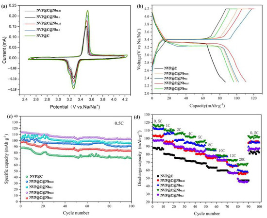 To evaluate the electrochemical oxidation/reduction features of both cathodes of NVP@C and NVP@C@Nb, cyclic voltammetry (CV) was performed initially (Figure 7a). The CV measurements were conducted in a coin-type R2016 cell configuration with Na metal as the counter electrode and tested in a potential region of 2.5–4.2 V (vs. Na/Na+) with 0.1 mV·s−1 sweep rate.